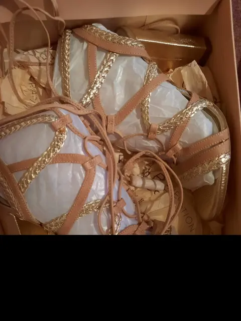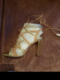 Sandalias con tacón. Sandalias de correas con tacón marca BCBGENERATION, talla 5, color Beige con dorado