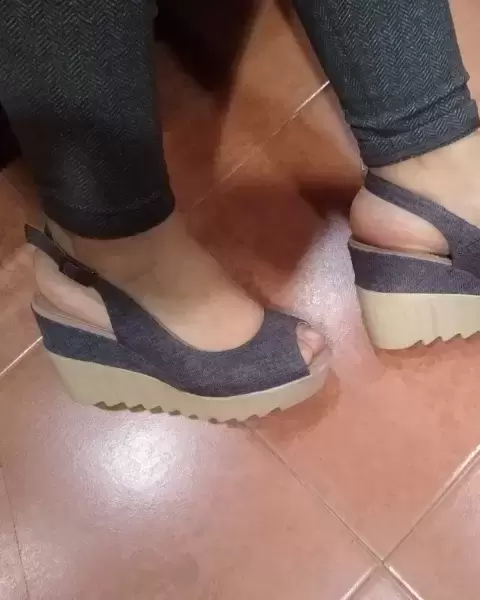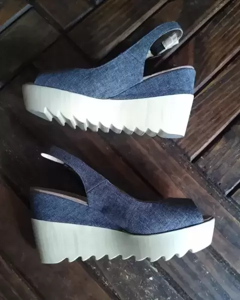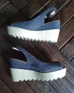 Bonitas sandalias destalonadas de plataforma y material de mezclilla en tono gris, en las fotos se ven azules por la luz, pero el tono real es donde las traigo puestas*Talla 3.5*Altura: 6cm*Sin detalles*Calificación:10*GRACIAS POR TU PREFRENCIA*
