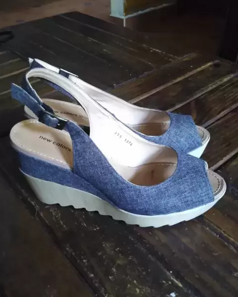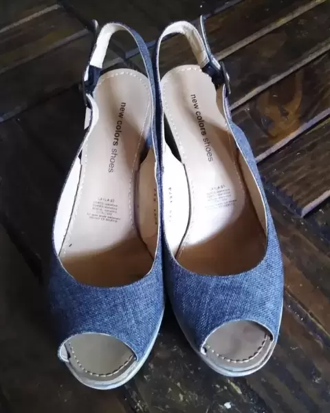 Sandalias de plataforma New Color Shoes. Bonitas sandalias destalonadas de plataforma y material de mezclilla en tono gris, en las fotos se ven azules por la luz, pero el tono real es donde las traigo puestas*Talla 3.5*Altura: 6cm*Sin detalles*Calificación:10*GRACIAS POR TU PREFRENCIA*