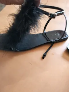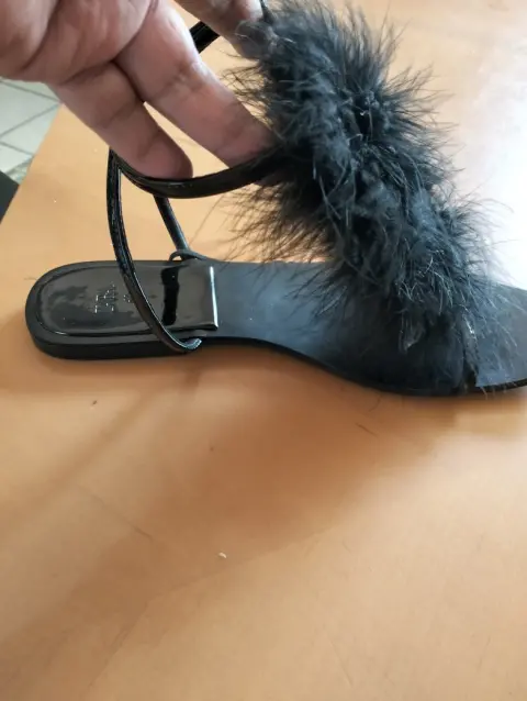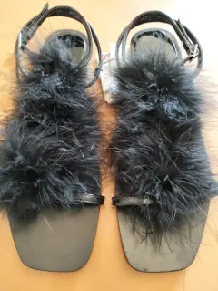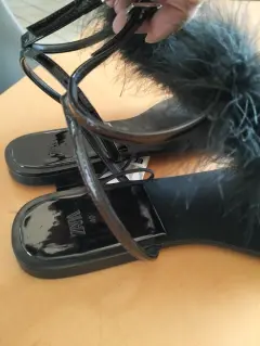 SANDALIAS DE PLUMAS. Bonitas y frescas sandalias de charol con plumas en empeine de tiras y correa en tobillo