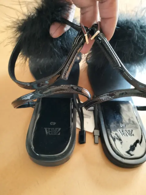 Bonitas y frescas sandalias de charol con plumas en empeine de tiras y correa en tobillo