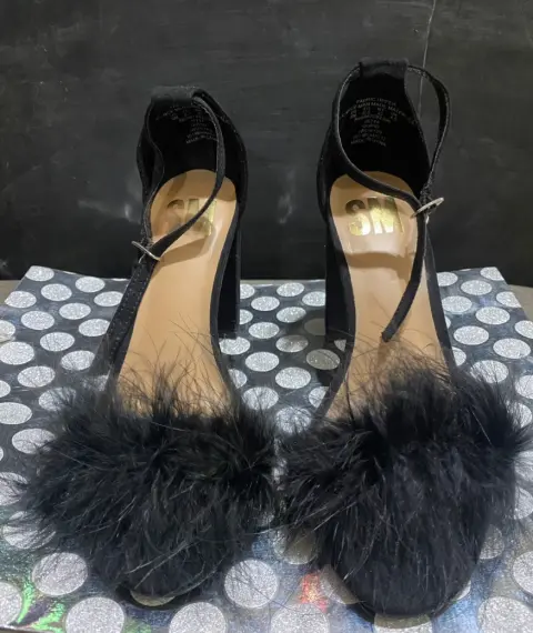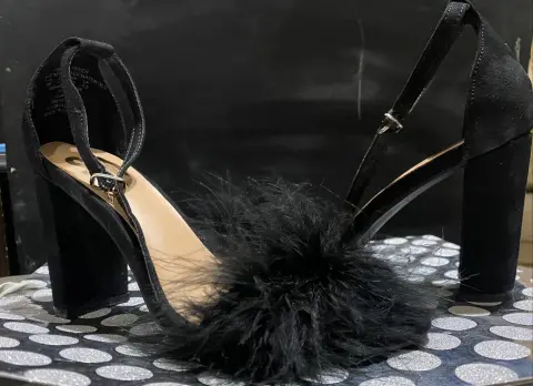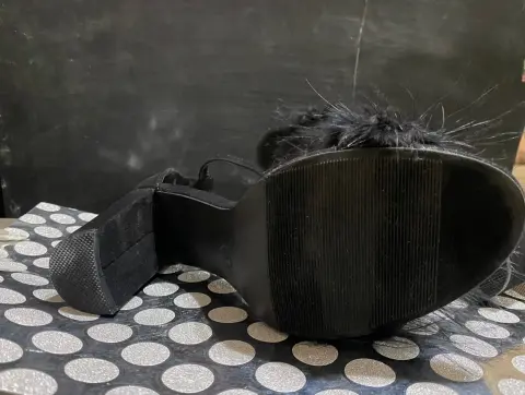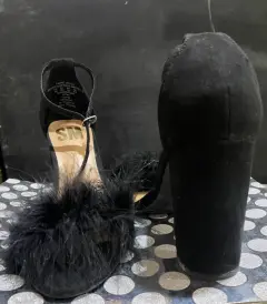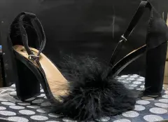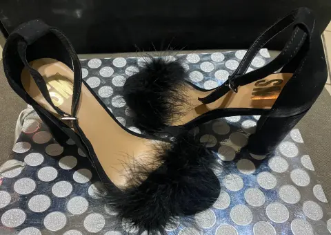 Sandalias de tacón alto, con corra en tobillo, gamuza sintética diseño con plumas, tacón grueso 9 cm de alto En excelentes condiciones sin detalles Talla 3