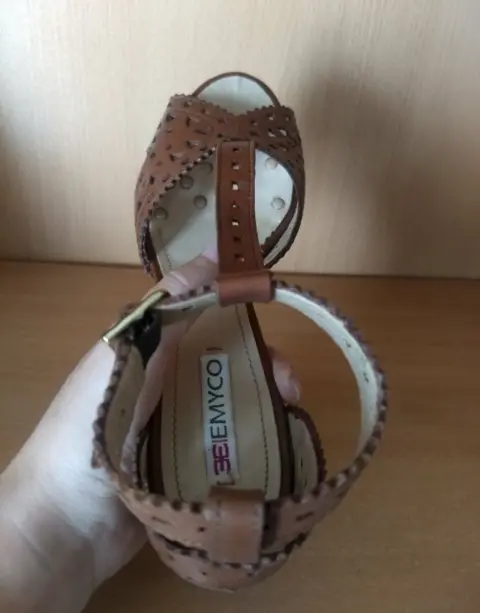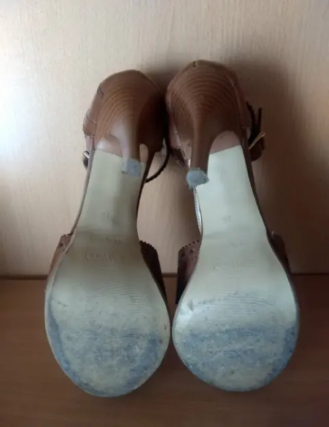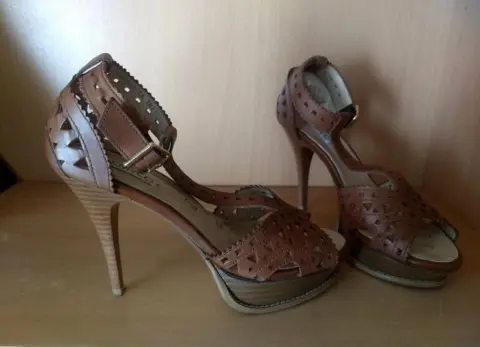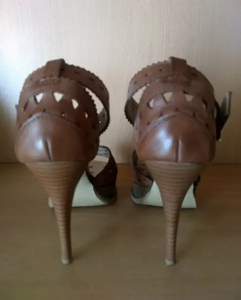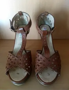 Sandalias de tacón corte láser. Sandalias de tacón y plataforma.Color café, corte láser.Piel.Talla: 3 1/2Tacón: 11 cmPlataforma: 2 cm