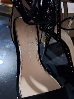 Sandalias de Tacón Jessica Simpson 2.5mx. Zapatillas de tacón abiertas, color negro con estopel plateado, totalmente nuevas, Talla 2.5 mx.