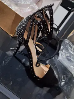 Zapatillas de tacón abiertas, color negro con estopel plateado, totalmente nuevas, Talla 2.5 mx.