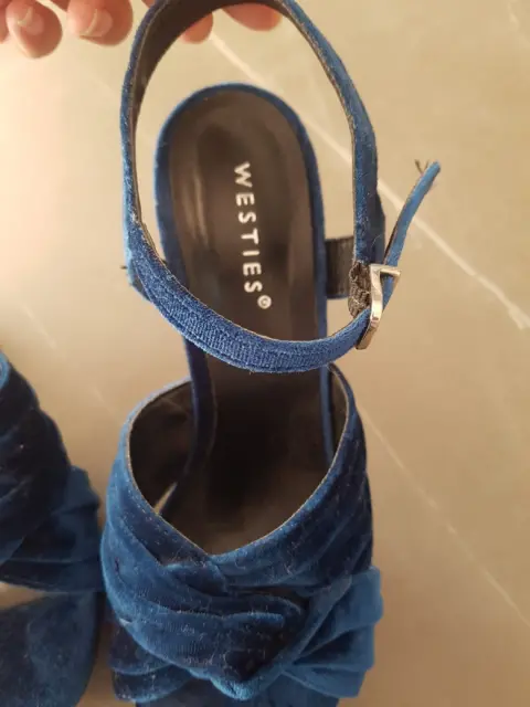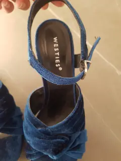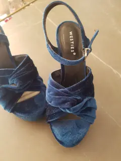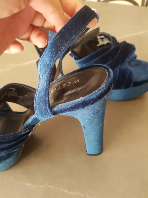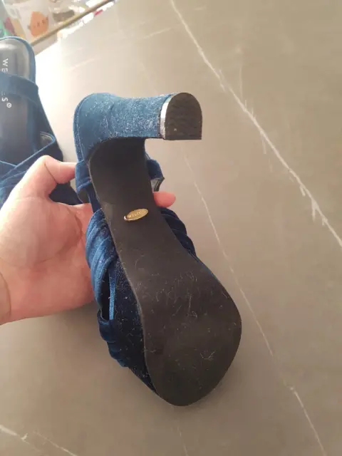 Sandalias de terciopelo azul petroleo, hermosas, sólo se usaron una vez, muy cómodas, tacón ancho