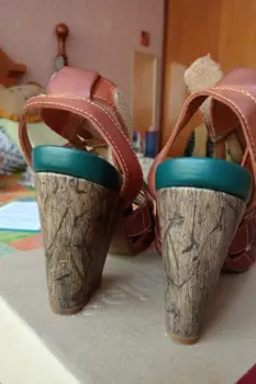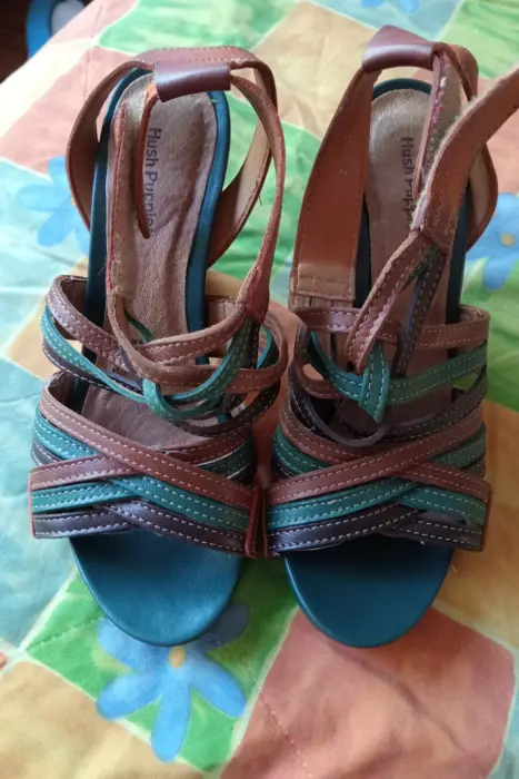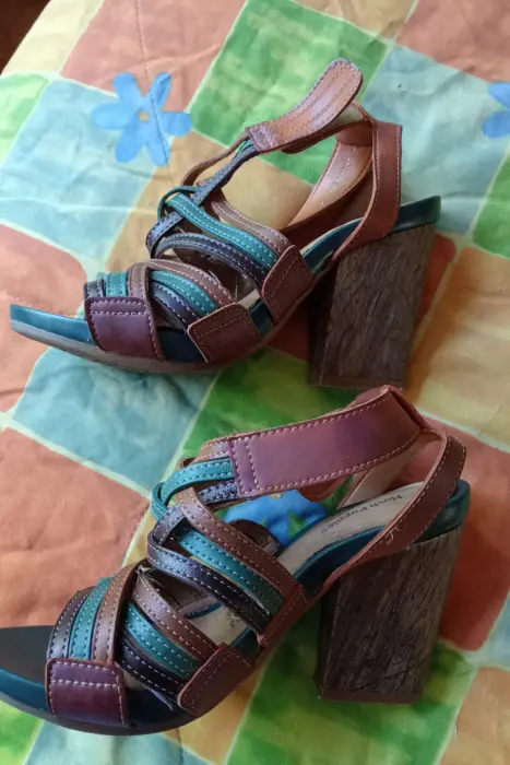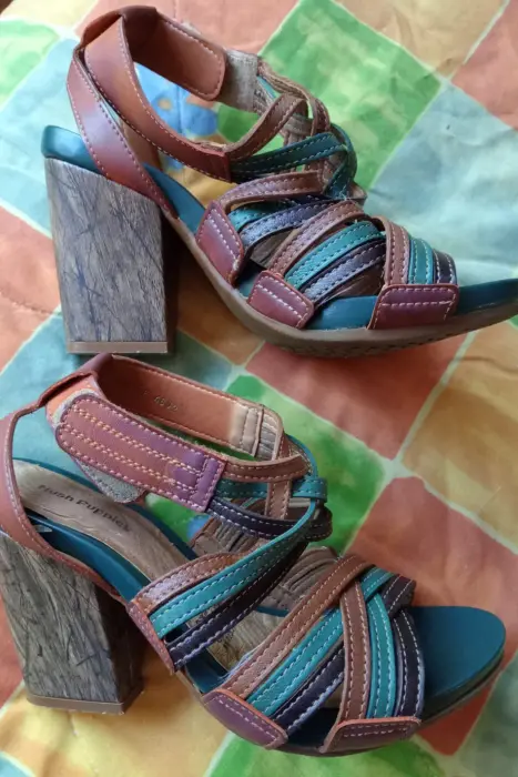 Sandalias de tiras en varios tonos, son de piel, el broche es de velcroNúmero 2.5tacón ancho, altura 9cmen perfecto estado