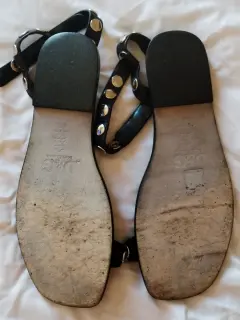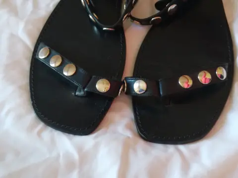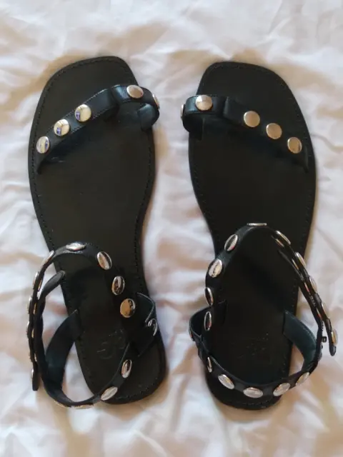 Lindas sandalias color negro de piel con estoperoles plateados, planas súper cómodas. En perfectas condiciones. Talla 25.5 cm.