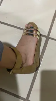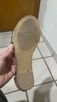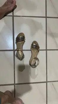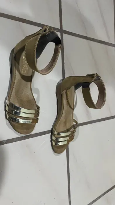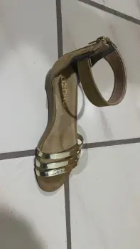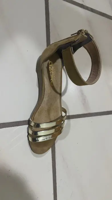 Sandalias doradas con 3 tiras al frente y aro en el tobillo para un mejor agarre, con mini tacón de 1cm. Marca Capa de Ozono, número 23