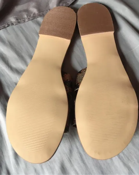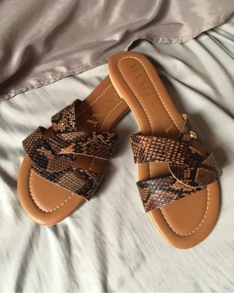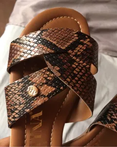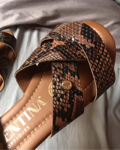 Sandalias estampada. Bellas y cómodas sandalias con estampado de víbora en tonos cafés con ligero tacón material sintético anti humedad, nuevas en número 6 cómodas y lindas