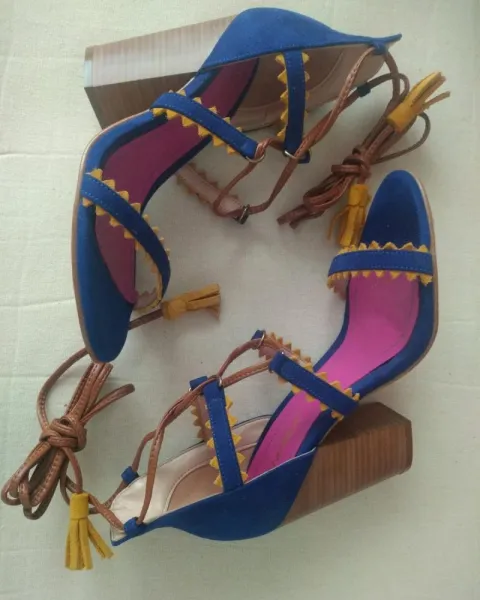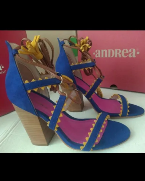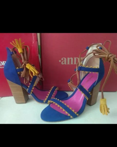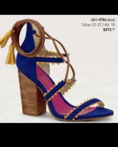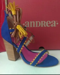 Sandalia azul marino con textura aterciopeladaDiseño bicolor de influencia étnica.Cordon ajustable alrededor del tobillo y tacón robusto amaderado con altura de 10 cm