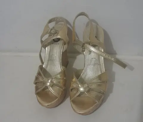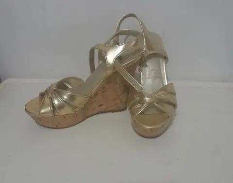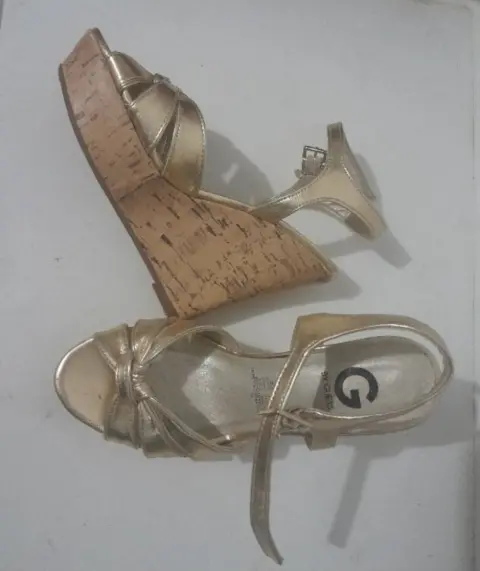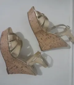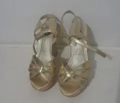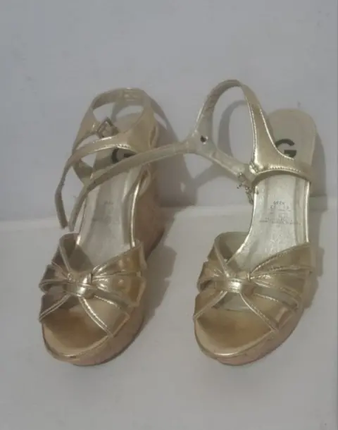 Sandalias de plataforma doradas, súper bonitas, muy combinables...poco uso, talla 2.5 pero vienen reducidas, creo quedarían mejor a talla 2. Pequeño detalle en punta, casi imperceptible