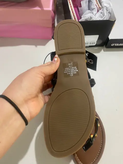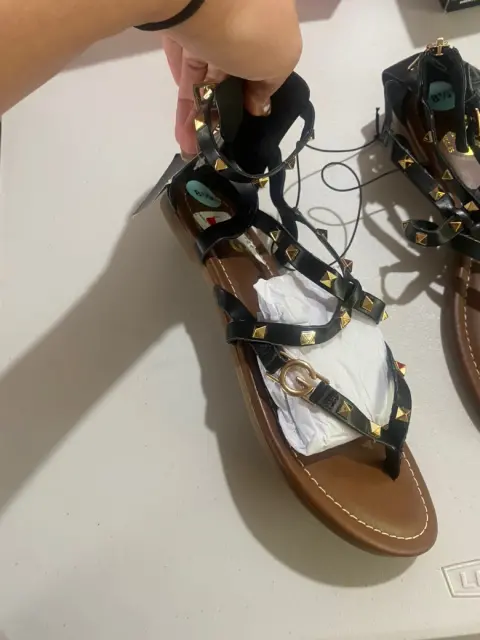 HERMOSAS SANDALIAS negras con estoperoles dorados. Marca visible al frente con en color dorado. Nuevos sin detalles. No vienen en caja.