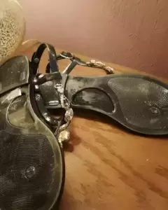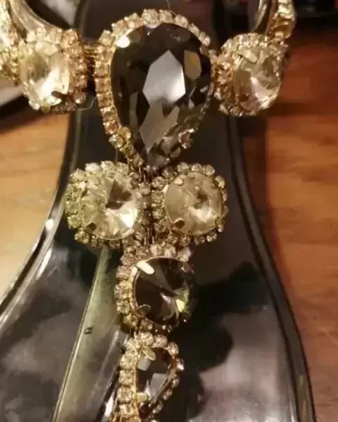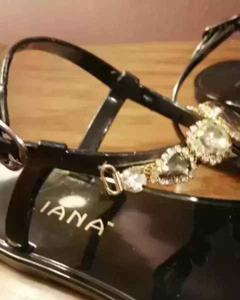 Sandalias increíblemente brillantes. Marca LilianaTalla: 36Color: negro brillantePiedrería central en diferentes tonos ,sin ningún detalle,toda la piedrería está completa en buen estadoHerrajes en buen estadoMaterial de la sandalia: PlásticoNo tiene caja originalSe entrega sanitizado