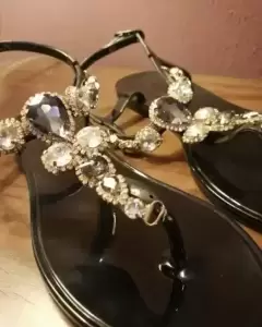 Marca LilianaTalla: 36Color: negro brillantePiedrería central en diferentes tonos ,sin ningún detalle,toda la piedrería está completa en buen estadoHerrajes en buen estadoMaterial de la sandalia: PlásticoNo tiene caja originalSe entrega sanitizado