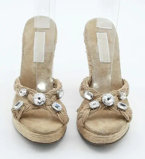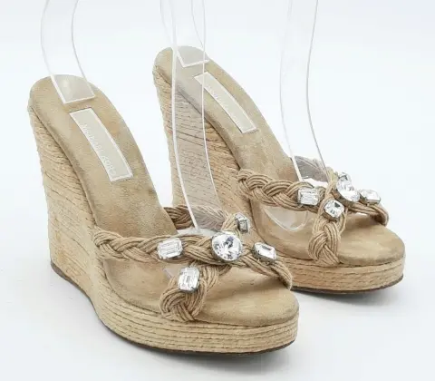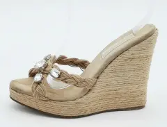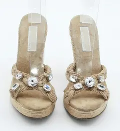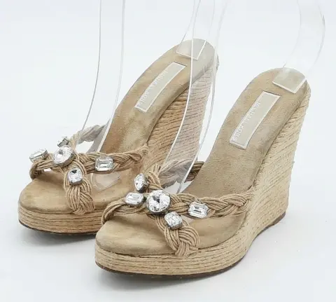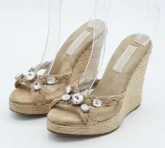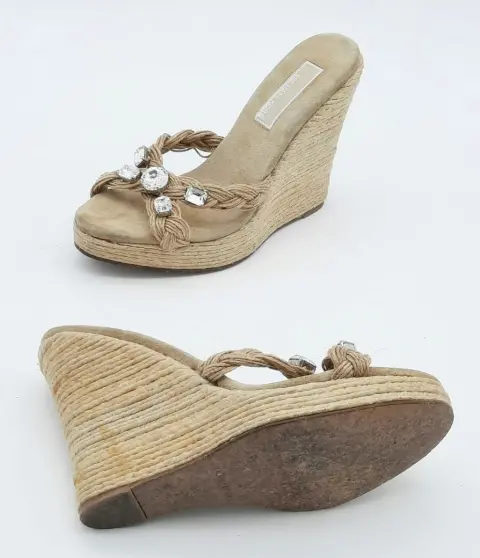 Hermosas sandalias wedge con detalle trenzado de yute con piedras brillantes de cristal, hechas en Italia muy raras de encontrar.Son usadas, tienen algunas manchitas de pegamento en el yute que cubre la plataforma ( ver fotos) no son muy notorios, talla 23mx (6 Usa).Altura de 12 cms.