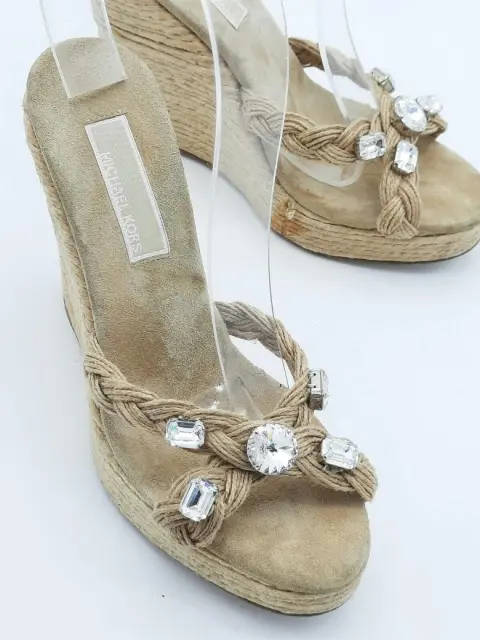 Sandalias Michael Kors 3mx. Hermosas sandalias wedge con detalle trenzado de yute con piedras brillantes de cristal, hechas en Italia muy raras de encontrar.Son usadas, tienen algunas manchitas de pegamento en el yute que cubre la plataforma ( ver fotos) no son muy notorios, talla 23mx (6 Usa).Altura de 12 cms.