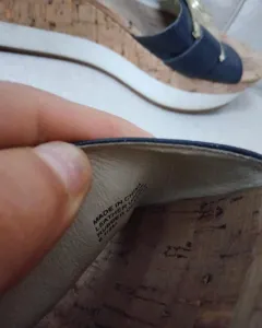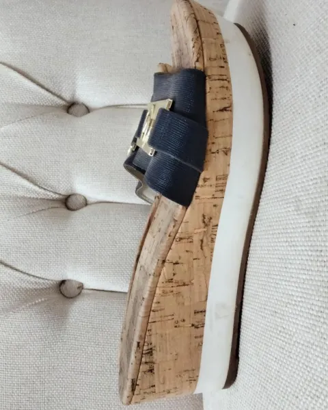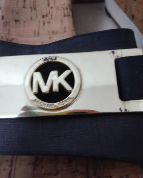 Sandalias MK azul marino único detalle está en la plaquita, no es de metal es plástica y tiene unos pedacitos descarapelado pero no se nota mucho.