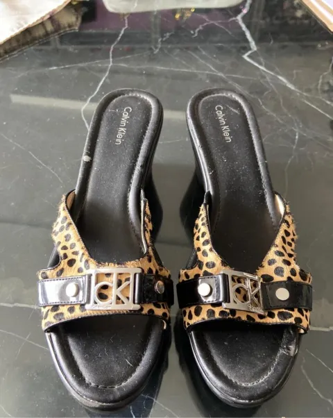 Sandalias negras Calvin Klein. Sandalias de plataforma negras con tipo piel de leopardo, o animal print, tiene 2 detalles se muestran en fotografías, no se nota ya puestos