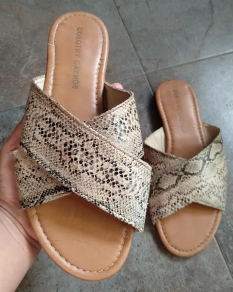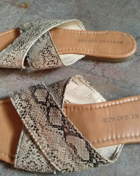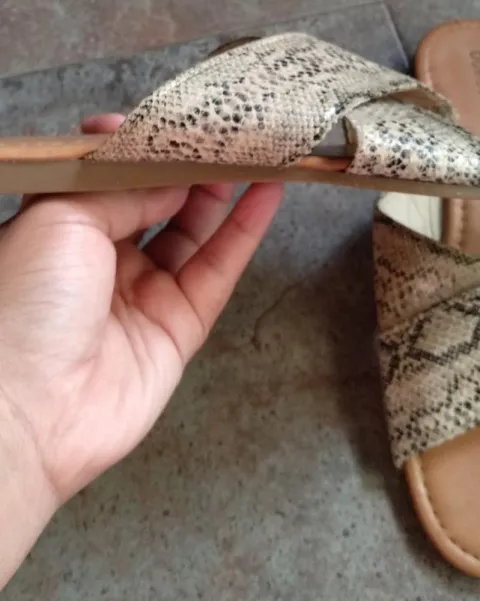Sandalias planas con estampado de vivora. En tendencia, super padres y comodas las tiras vienen cruzadas, el detalle se ve en la ultima foto se descarapero un poquito es minimo puestas lo cubre el pie no afecta su uso