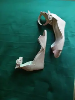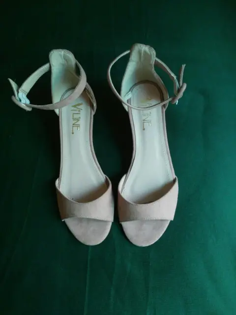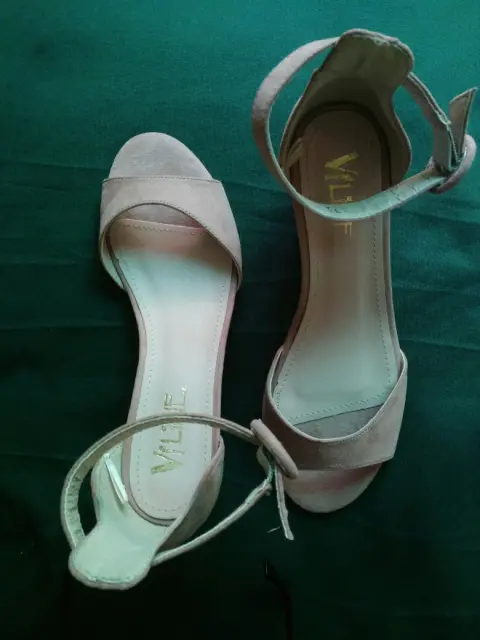 Sandalias rosas. Sandalias color rosa Vline, talla 3, imitación gamuza, tacón cuña, alto 5 cm., correa de tobillera, detalle de hebilla circular.