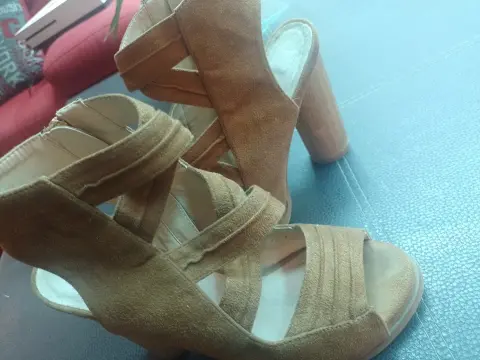 Hermosas sandalias color camel, piel gamuza, tacón circular alto, cierre posterior, súper combinables. ¡Dales una segunda oportunidad! También disponible en paquete con falda del mismo tono y tipo de tela.