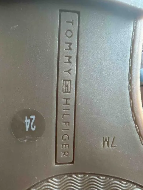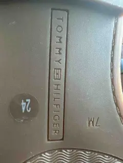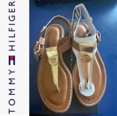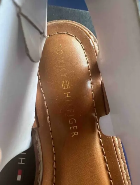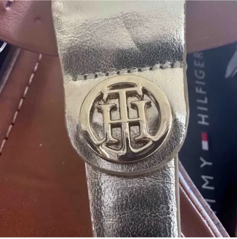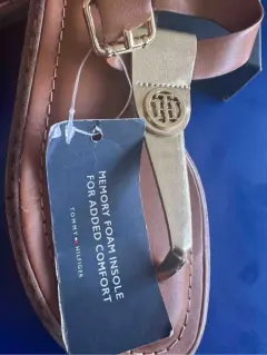 Sandalias Tommy Hilfiger. Sandalias de piso color café con vivos dorados de piso tacón corrido en forma de pata de gallo con hebilla al lado escudo dorado súper casuales no tiene ningún detalle son NUEVAS