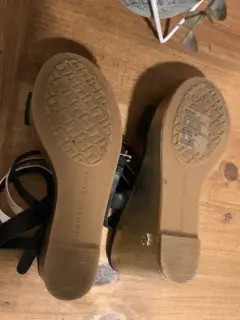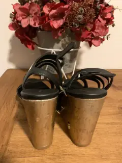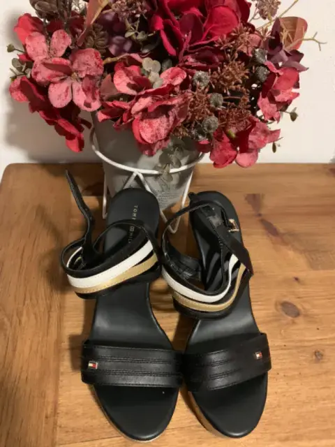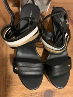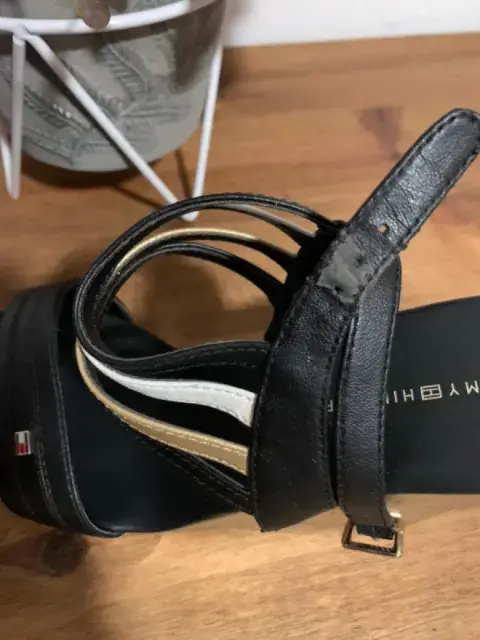 Sandalias tommy Hilfiger. Zapatos Tommy Hilfiger Negro blanco y dorado. Con detalle de descarapelado en las tiras del seguro. Alto de tacón 10 cms. Solo un uso se le dio, están hermosos.