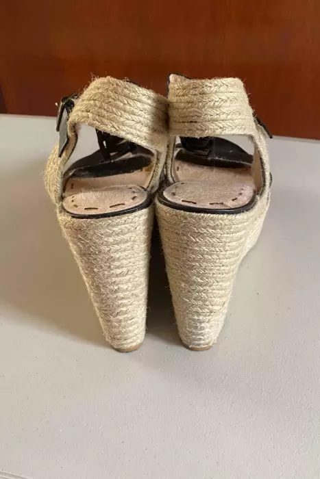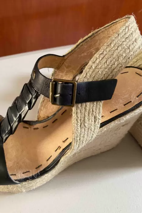Sandalias Wedge NegrasSuper lindas para usar en época de calorMarca Nine WestColor Negro con plataforma de yuteTalla 5.5 Usa 8.5Tacón altura 12 cmPlataforma altura 4 cmComodidad 10 de 10 *Detalles en el interior por el uso y por el tiempo que en nada disminuyen su funcionalidad. Se está descarapelando el interior consecuencia de tenerlos guardados, por eso los pongo a la venta, ya no los uso.