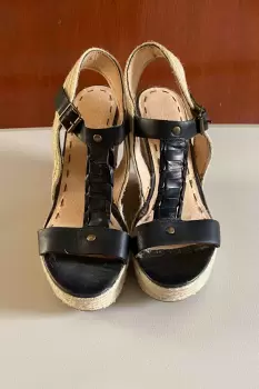 Sandalias Wedge Negras. Sandalias Wedge NegrasSuper lindas para usar en época de calorMarca Nine WestColor Negro con plataforma de yuteTalla 5.5 Usa 8.5Tacón altura 12 cmPlataforma altura 4 cmComodidad 10 de 10 *Detalles en el interior por el uso y por el tiempo que en nada disminuyen su funcionalidad. Se está descarapelando el interior consecuencia de tenerlos guardados, por eso los pongo a la venta, ya no los uso.