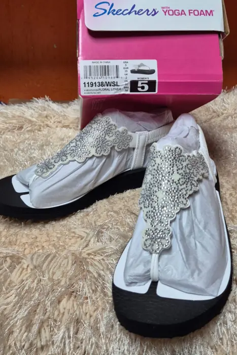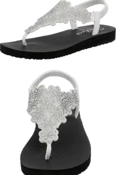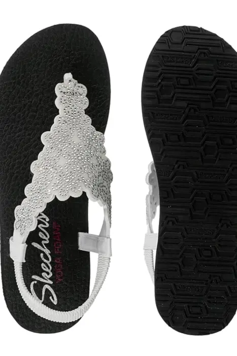 Skechers Meditation Floral T-22Mx/5Us. Sandalia Casual Yoga FoamPlantilla acolchada con espuma de yogaPuente para dedos de tela suaveCorte láser floral y detalles de estrásTacón plano de 1,3 cm