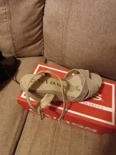 Zapato de dama. Zapatilla de dama con tacón y hebilla al tobillo,en color arena, número 5