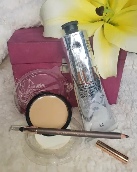 Pre-shampoo 100g. Accion anti-quiebre para reconstrucción de fibra capilar . Con manteca de murumuru, se usa en cabello húmedo antes del shampoo y acondicionador , ya que prepara el cabello para una mayor hidratación. Ekos Natura Murumuru.Repuesto de polvo compacto claro 24 con esponja de aplicación.Lápiz kajal color marrón de natura UNA, trae esponja incluida para difuminar. Todo con tapa y cajas .