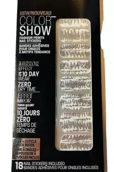 Pegatinas para uñas, con estampados muy originales, resistente al agua. Producto totalmente nuevo.MAYBELLINE NEW YORK- new COLOR SHOW CHEETAH CHIC FASHION PRINTS 19 NAIL STICKERSRUNWAY READY PRINTS SHOW STOPPING STATEMENT- DRESS YOUR NAILS WITH RUNWAY READY UNIQUE DESIGNS18 nail stickers , nail file and cuticle stick included.