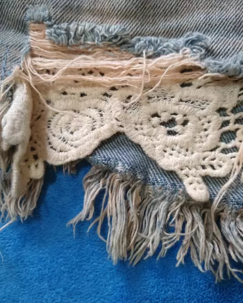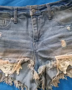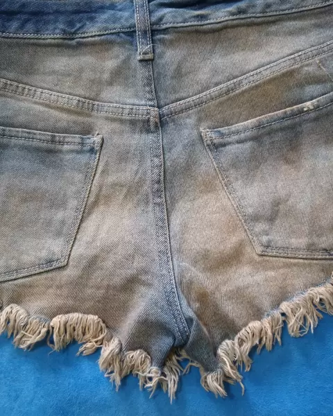 Short corto de mezclilla. Short de mezclilla con bolsas traseras y delanteras detalles de barbitas y tejidos en la parte baja
