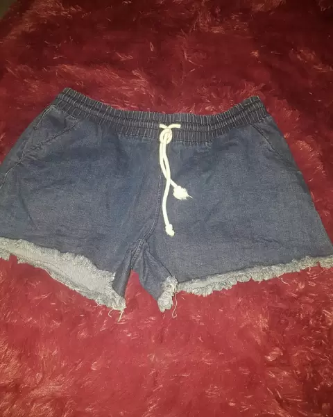 Short de mezclilla corto. Con resorte y lazo en cintura, tiene bolsas a los lados El color del short es del color mezclilla del elastico de la foto 3. De cintura mide 42. De cadera 53 y de largo 31 cm. Es stretch
