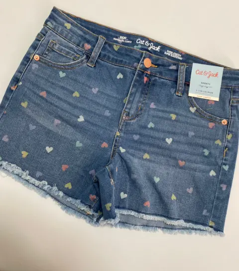 Short de mezclilla. Short corto de mezclilla strech , talla 10-12 con estampado de corazones de colores Maraca americana cat & jack