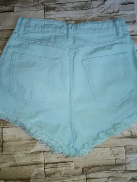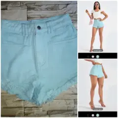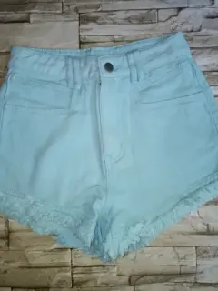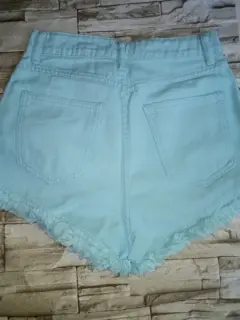 Short de mezclilla. Short de mezclilla a la cintura,con bolsillo oblicuo,ribete sin dobladillo desmechado,color azul turquesa lavado