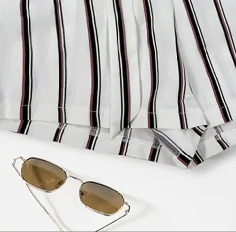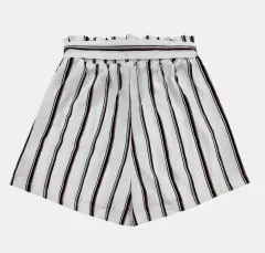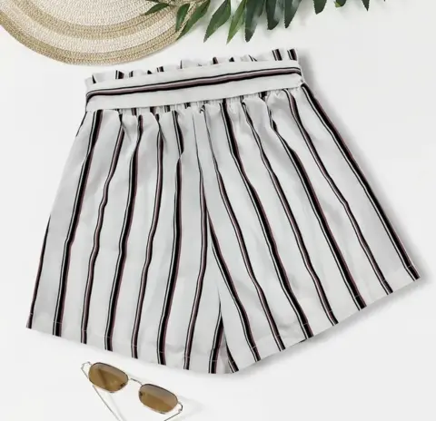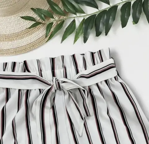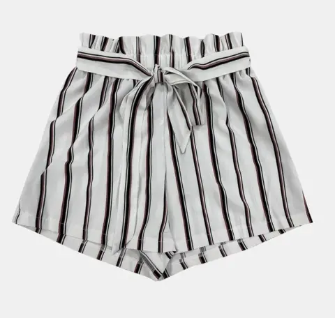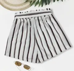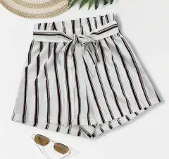 Short con resorte eatampado de rayas y cinturón decorativo de tela.No tiene broches para que no sufras más.