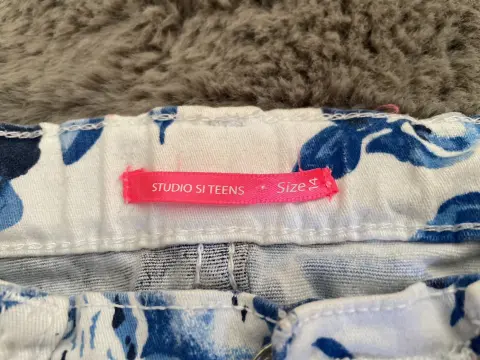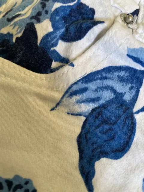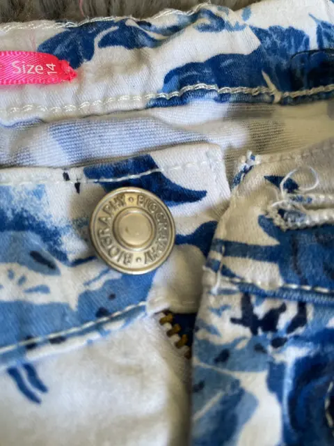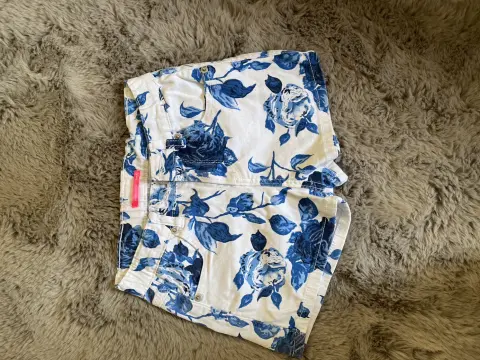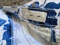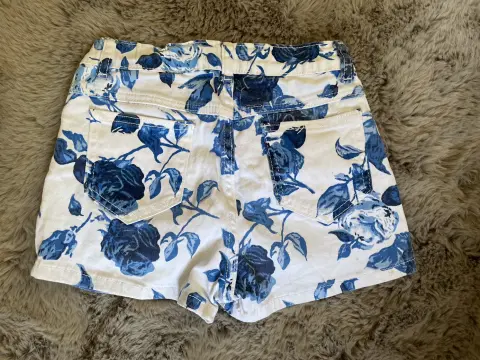 Short niña 4 años - kids. Short de mezclilla blanco con estampados azules, para niña talla 4-5, es Perfecto estado y con cubra ajustable en la cintura