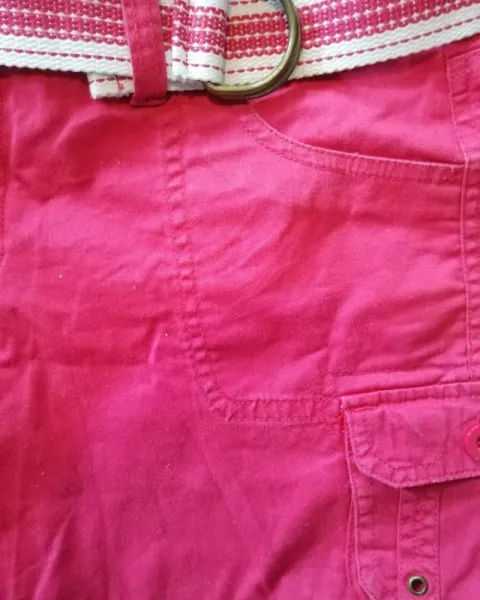 Short rosa con cinturón. Short color rosa mexicano con cinturón blanco con rosa. Talla medina. Tiene 2 bolsas a los lados y dos al costado con botón.MedidasCintura 45 cmLargo total 37 cmLargo del tiro 24 cmCadera 49 cm