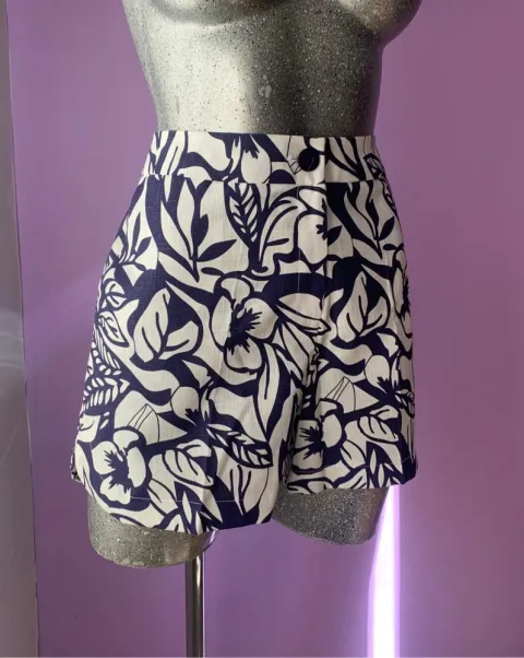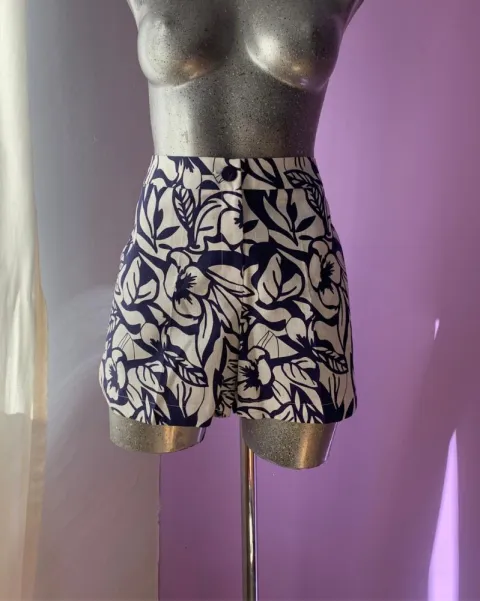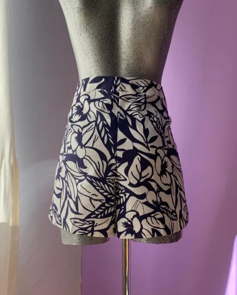 Hermoso short tipo lino, corto, blanco con flores azules. Le va bien a una talla grandeSus medidas son: 38cm de largo y 86cm de circunferencia de cintura.