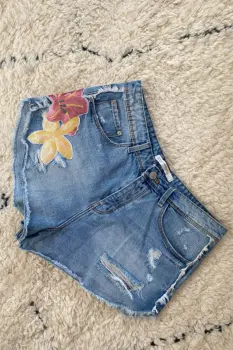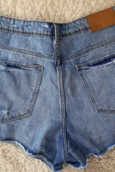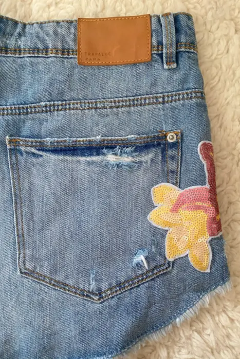 Short Zara Mezclilla. Padrísimo short de ZARA TRAFALUC TRF, tela mezclilla denim, con efecto despuchinado y parche de flores en lentejuelas. Efecto deshilachado.