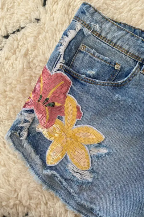 Padrísimo short de ZARA TRAFALUC TRF, tela mezclilla denim, con efecto despuchinado y parche de flores en lentejuelas. Efecto deshilachado.