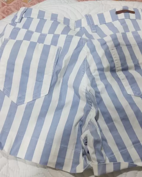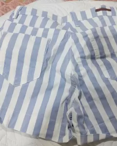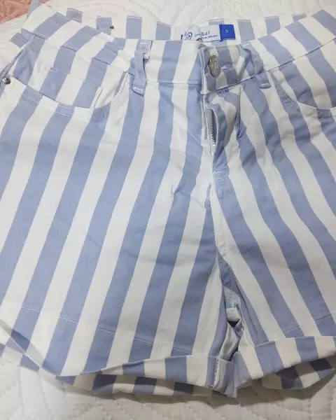 Shorts azul celeste. Short de rayas, es de la marca de C&A, solo lo lavé, nunca lo use y cuando me lo probé, ya no me quedaba 😭Es talla 3, la tela no estira, es tipo mezclilla pero delgada, es exacta, tiene un pequeño doblez.