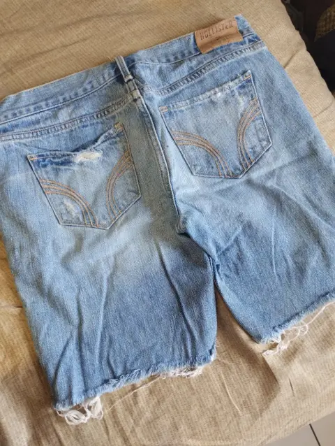 Shorts de mezclilla, poco uso, rasgado, talla 27, marca Hollister, a media pierna.