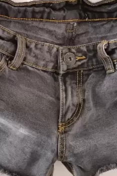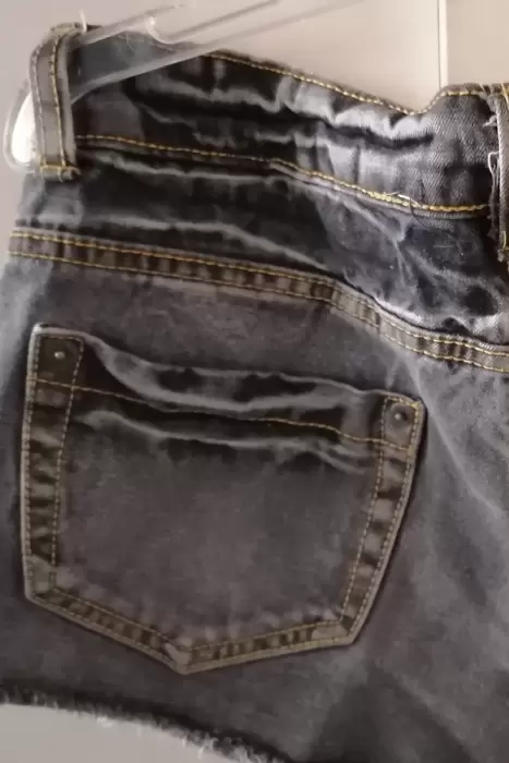 Shorts de Mezclilla negro con bolsas delanteras y traseras. Decorado con hilos amarillos.Sin marca ni etiqueta.