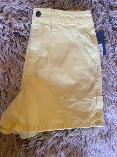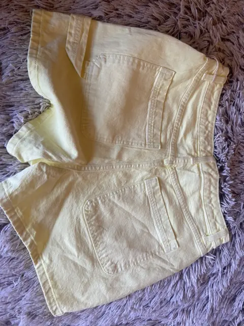 Shorts de mezclilla midi. Short tiro alto de mezclilla color amarillo suave, NO tiene estrech Medidas cintura 39cm, cadera 50cm y largo 41 talla 6/28