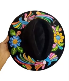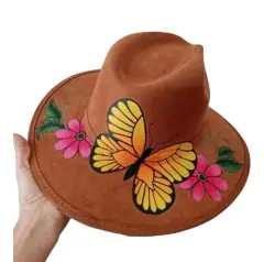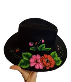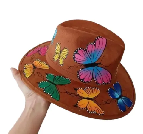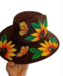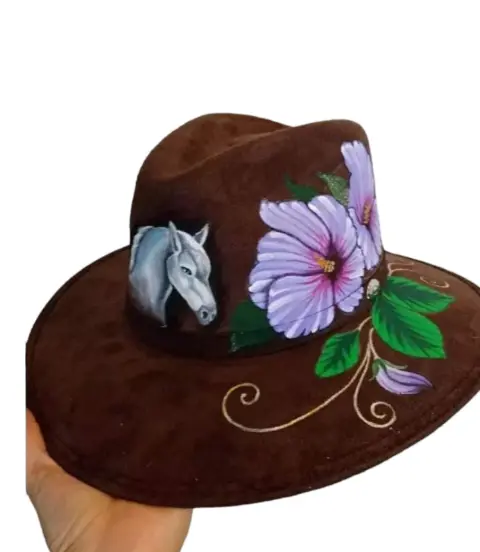 Sombrero talla M de gamuza pintados a mano, diferentes diseños. Abarca 57, 58 centímetros de diámetro. Tenemos el complemento para verte única.