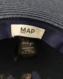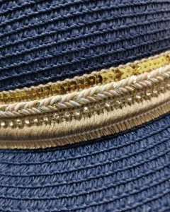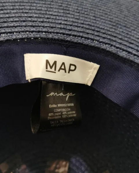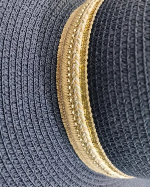 Sombrero de playa Map. Sobrero playero Nuevo. Color azul marino. Con detalle de cinta beige, tejida, bordada y con pedrería. Ala ancha. Redondo. Hueco para la cabeza 19 cm diámetro, circunferencia 56.5 cm. Diámetro total 42 cm.